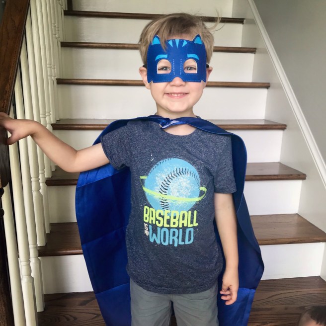 We packed his cape and mask into his backpack, and as soon as we got to school he excitedly unpacked it and put it in his cubby. He could not wait to share his item with his friends. When I came to pick him up, I found Will in full costume playing with his friends. He proudly informed me that he wore his Catboy cape and mask all day; he would barely take it off to get in the car for the ride home. He barely stands still for pictures nowadays, but today was an exception. He proudly stood on the stairs and let me get a picture of him in full costume. Love this kid.