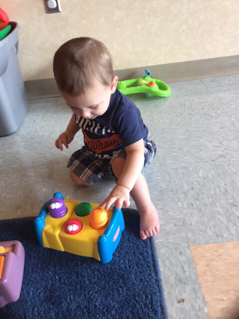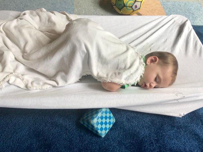 As I walked into his classroom today, I finally caught him sleeping on his cot. This is a new activity for him; within the past week, his teachers have transitioned him from the crib to a cot. Apparently he took no time at all transitioning; he did well right away. I remember Will was the same way. It amazes me what these teachers are able to get these little ones to do.