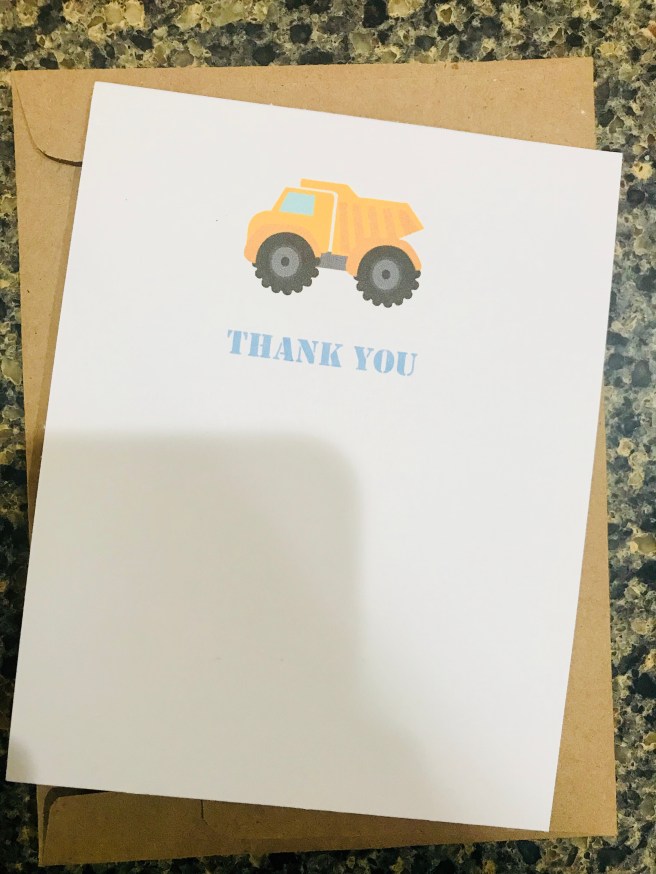 I needed to send thank you cards for Nathan’s birthday guests, and I could not find the simple construction-theme thank you card I had in mind, so I decided to make one instead. It took only five minutes to create on Word, and I just love the way it turned out. Such a simple detail to make his thank you cards a little more personal.
